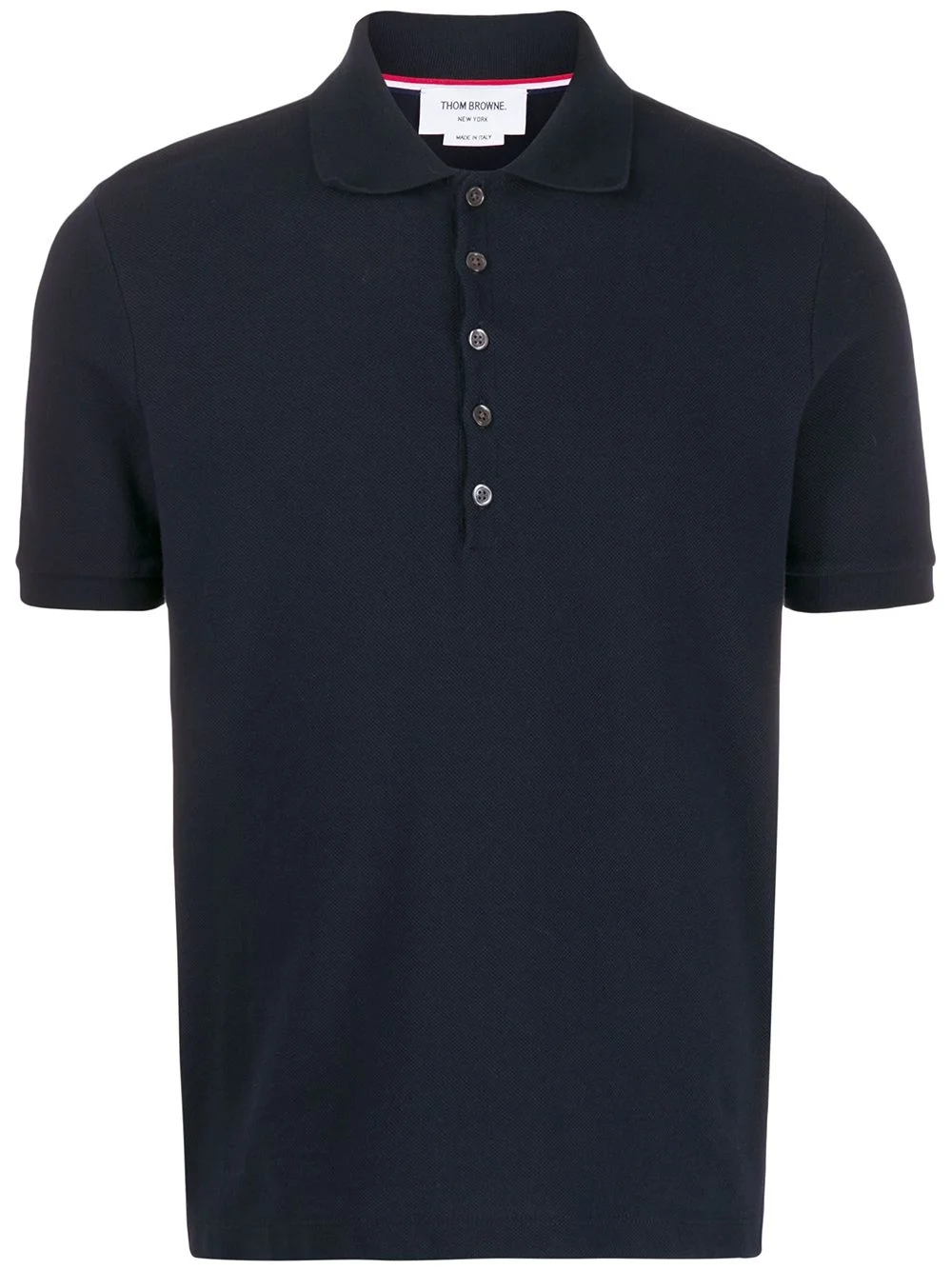 4-Bar pique polo shirt When smart and casual collide, you get this dark navy blue cotton polo shirt from Thom Browne. Topped with a spread collar, the style boasts the signature 4-bar stripes on the side. A wardrobe classic if we ever saw one. Featuring a spread collar, a front button fastening, short sleeves, a straight hem and 4-bar stripes at the side. Made in Italy Composition Cotton 100% SIZE & FIT Model measurements Height 6 ft 2 in(1.88 m) Bust/Chest 36.61 in(93 cm) Hips 35.82 in(91 cm) Waist 27.95 in(71 cm) Measurement CHEST 42.51 in(108 cm) Shoulder Width 17.71 in(45 cm) FittingInformation This piece fits true to size. We recommend you get your regular size Cut for a relaxed fit Made with a mid-weight fabric Washing instructions Dry Clean Only