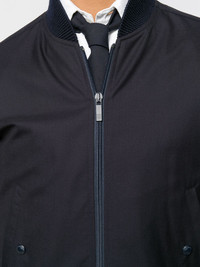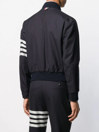 4-Bar bomber jacket Highlights - Navy blue - Wool - Signature 4-bar tab - Front zip fastening - Baseball collar - Long sleeves - Two press-stud fastening side pockets - Ribbed trim - Signature grosgrain loop tab - Striped cotton lining - Straight hem Made in Italy Composition Lining: Cotton 100% Outer: Wool 100% SIZE & FIT Measurement CHEST 41.73 in(106 cm) SLEEVE LENGTH 25.98 in(66 cm) Shoulder Width 16.53 in(42 cm) FittingInformation Designed for a slim fit, offering a comfortable fit that sits just away from the body Made from a midweight non-stretch fabric This piece fits true to size – take your usual size Washing instructions Dry Clean Only