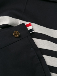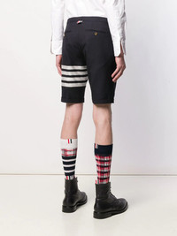 4-Bar plain weave suiting shorts Highlights - Combining the highest-quality fabrics and a conservative sensibility with a touch of irreverence and humour, these navy wool 4-bar plain weave suiting shorts from thom browne are a classic. featuring a concealed front fastening, four white stripes, back jetted pockets and turn-up hems. Made in Italy Composition Wool 100% SIZE & FIT FittingInformation This piece fits true to size. We recommend you get your regular size Regular fit Made with a mid-weight non-stretch fabric Washing instructions Dry Clean Only