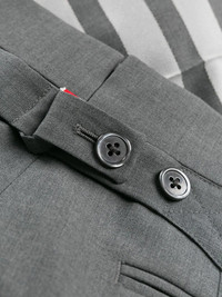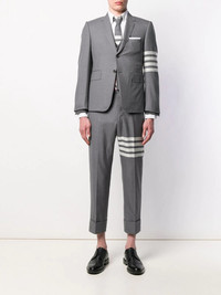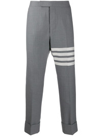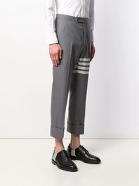 4-Bar plain weave suiting trousers Thom Browne produces new takes on men's fashion with creative prints and cuts. These medium grey wool plain weave suiting 4-bar trousers from Thom Browne feature an off-centre front button fastening, side pockets, back pockets, a stripe detail to the side, a cropped length and a slim fit. Made in Italy Composition Wool 100% SIZE & FIT FittingInformation Designed for a slim fit, offering a comfortable fit that sits just away from the leg Made from a midweight non-stretch fabric This piece fits true to size – take your usual size Measurement INSIDE LEG 35.82 in(91 cm) FRONT RISE 12.99 in(33 cm) WAIST 32.28 in(82 cm) Washing instructions Dry Clean Only