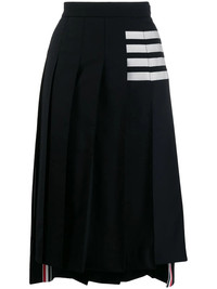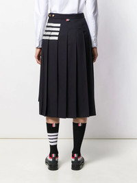 4-Bar pleated skirt RWB details? A 4-Bar stripe? Iconic Thom Browne details are everywhere you turn on this piece. Slip it on and wait for the compliments to roll in. Featuring a high waist, a side button fastening, a pleated design, a high low hemline, a mid-length, a signature grosgrain loop tab, a 4-Bar stripe and RWB stripes. Made in Italy Composition Wool 100% SIZE & FIT Model measurements Height 5 ft 10 in(1.78 m) Bust/Chest 32.67 in(83 cm) Hips 35.82 in(91 cm) Waist 24.01 in(61 cm) FittingInformation This midi-length skirt is intended to be worn high on the waist Made from a midweight non-stretch fabric This piece fits true to size – take your usual size Washing instructions Dry Clean Only