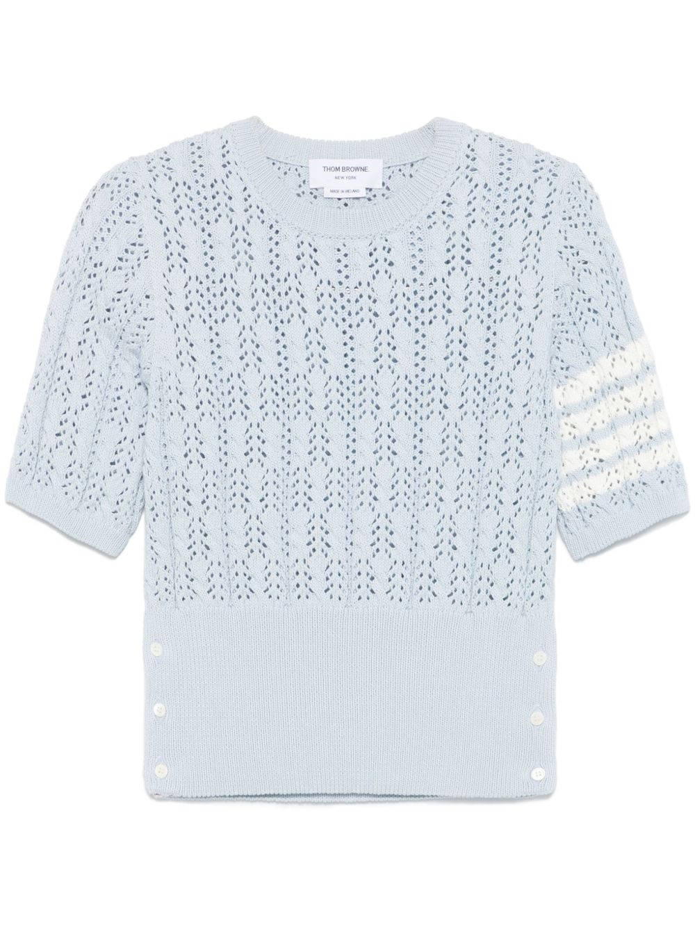 4-Bar pointelle T-shirt Highlights - Sky blue - Side button fastening - Ribbed cuffs and hem - Logo tag Made in United Kingdom Composition Cotton 100% SIZE & FIT Model measurements Height 5 ft 11 in(1.8 m) Bust/Chest 32.67 in(83 cm) Hips 36.22 in(92 cm) Waist 24.4 in(62 cm) FittingInformation Designed for a slim fit that sits just away from the body offering a close yet comfortable fit Made with a midweight knit, this piece offers some stretch