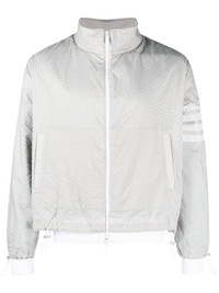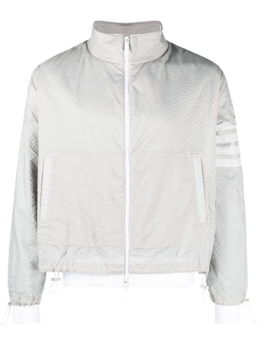 4-Bar ripstop jacket Modelled on technical styles, Thom Browne’s jacket is crafted from ultra-lightweight ripstop. The light-grey backdrop spotlights the brand’s contrasting 4-Bar stripes at the sleeve. Highlights - Light grey/white - Ripstop texture - Lightweight construction - Signature 4-bar stripe - Funnel neck - Front zip fastening - Long sleeves - Drawstring cuffs - Two side slit pockets - Drawstring hem Made in Italy Composition Outer: Polyamide 100% Cotton 100% SIZE & FIT Model measurements Height 6 ft 2 in(1.87 m) Bust/Chest 38.18 in(97 cm) Hips 36.61 in(93 cm) Waist 29.13 in(74 cm) Measurement CHEST 51.96 in(132 cm) LENGTH 27.55 in(70 cm) WAIST 47.24 in(120 cm) SLEEVE LENGTH 25.19 in(64 cm) FittingInformation Designed for a regular fit, allowing for a comfortably loose fit throughout the body The internal drawstring at the hem allows for fitted preferences Made from a midweight non-stretch fabric This piece fits true to size – take your usual size Washing instructions Dry Clean Only