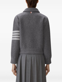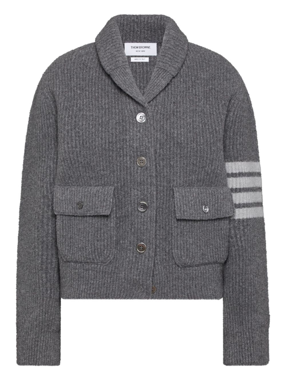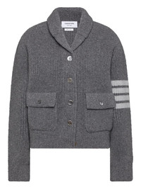4-bar shawl-collar bomber jacket Highlights - Medium grey - Boiled merino wool - Shawl collar - 4-bar stripe detail - Ribbed knit - Front patch pockets Made in Italy Composition Virgin Wool 100% SIZE & FIT FittingInformation Designed for a relaxed fit, this piece allows for comfort and movement when worn Made with a midweight knit, this piece offers some stretch Washing instructions Read Manufacturer Guidelines