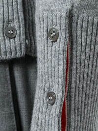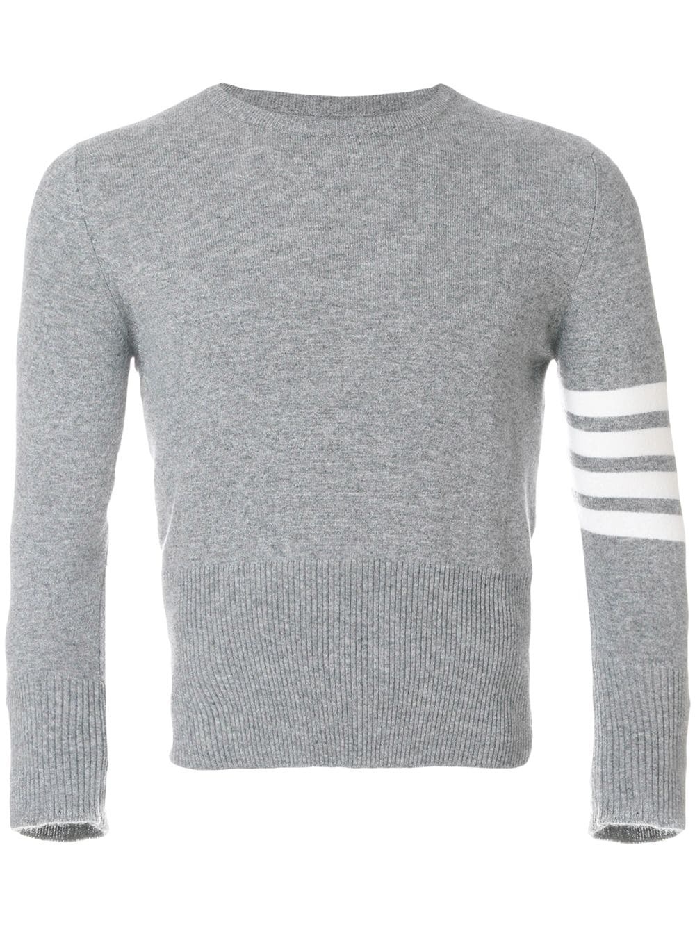 4-Bar Short Cashmere Pullover Enjoy that preppy feel without the judgement. Crafted from light grey cashmere, this Thom Browne 4-Bar Short Cashmere Pullover has the classic four-bar stripe detail. Always classy. Featuring a knitted style, a fitted silhouette, a signature tri-colour striped trim, ribbed details, long sleeves, button cuffs, a four-bar stripe on the upper arm and side button fastenings. Made in United Kingdom Composition Cashmere 100% SIZE & FIT Measurement CHEST 39.37 in(100 cm) Shoulder Width 15.74 in(40 cm)