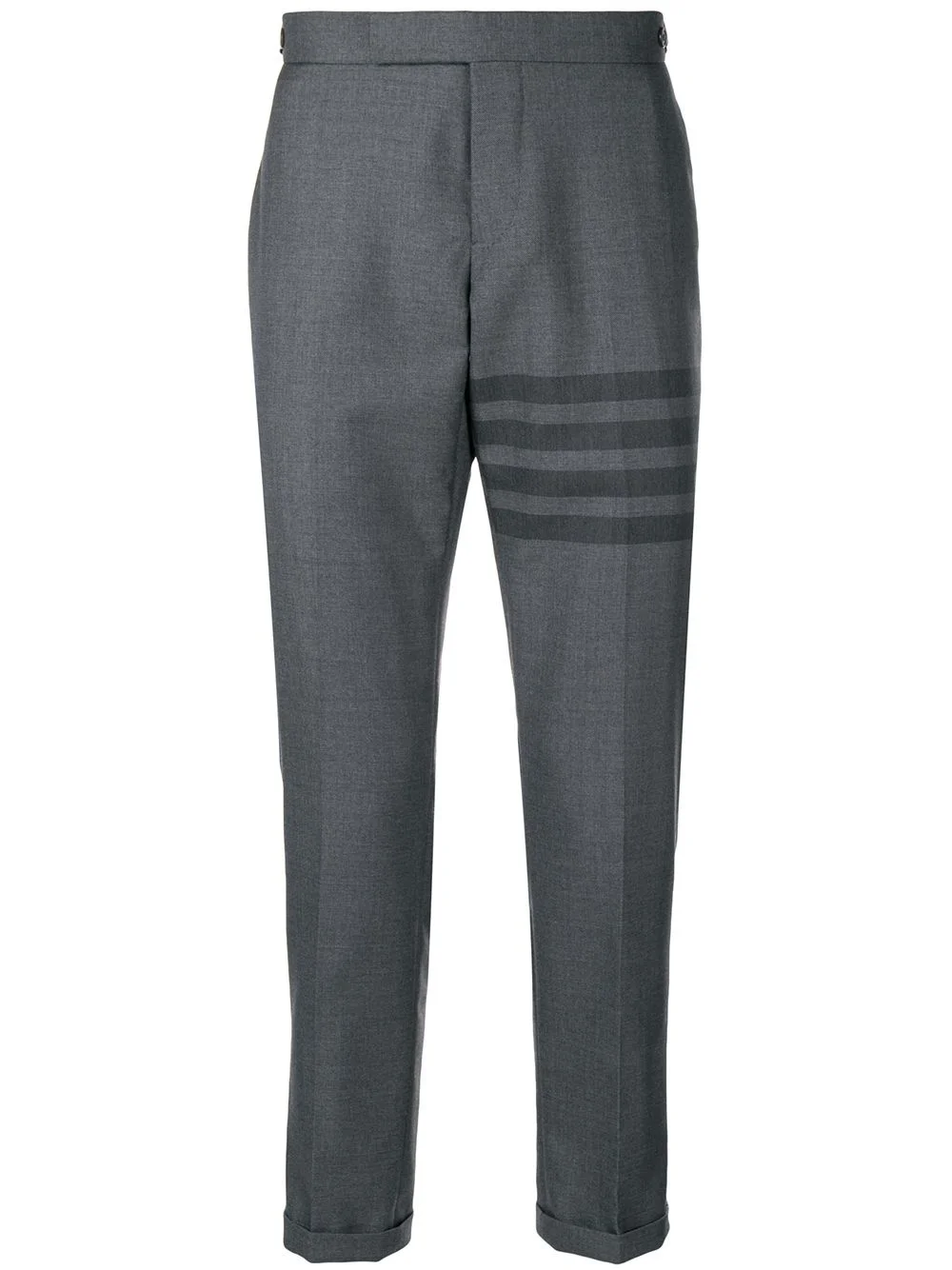 4-Bar Skinny-Fit Trouser Grey wool-blend 4-Bar Skinny-Fit Trouser from Thom Browne featuring a low rise, a skinny fit, a hook and zip fastening, turn up cuffs, side pockets, two back buttoned welt pockets, creases, a signature tri-colour striped trim and four-bar stripes at the left thigh. Made in Italy Composition Polyester 50%, Wool 50% SIZE & FIT Model measurements Height 6 ft 2 in(1.87 m) Bust/Chest 38.18 in(97 cm) Hips 36.61 in(93 cm) Waist 29.13 in(74 cm) Measurement FRONT RISE 9.05 in(23 cm) INSIDE LEG 32.28 in(82 cm) Hem Width 14.17 in(36 cm) WAIST 34.64 in(88 cm) Washing instructions Dry Clean Only