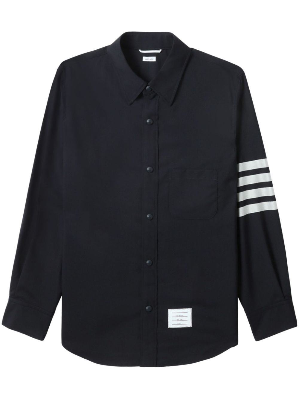 4-Bar sleeve shirt Were you asked to throw some bars? Only if that means the 4-Bar stripe detail on this shirt's sleeve. Rap with Thom Browne. Highlights - Navy - Cotton/wool - Classic collar - Front button fastening - Long sleeves - Signature 4-bar stripe - Chest patch pocket - Logo patch to the front - Buttoned cuffs Made in Italy Composition Cotton 100%, Wool 100% SIZE & FIT Model measurements Height 6 ft 2 in(1.88 m) Bust/Chest 36.61 in(93 cm) Hips 35.82 in(91 cm) Waist 27.95 in(71 cm) FittingInformation This piece fits true to size. We recommend you get your regular size Cut for a loose fit Made with a mid-weight non-stretch fabric Measurement CHEST 42.12 in(107 cm) SLEEVE LENGTH 33.46 in(85 cm) Shoulder Width 16.92 in(43 cm) Washing instructions Dry Clean Only