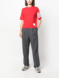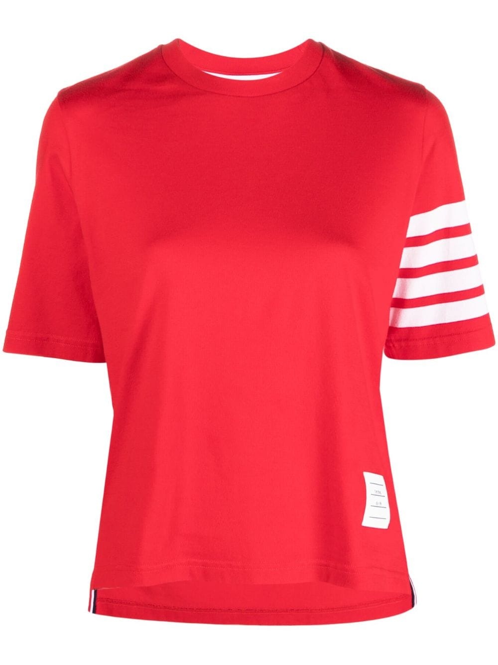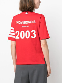 4-Bar Stripe 2003-print T-shirt Thom Browne presents a sporty aesthetic with this T-shirt. In vibrant rd, this piece boasts the brand's 2003 print to the back along with the brand's signature 4-Bar stripe to the sleeve. Highlights - Bright red - Signature 4-bar stripe - Logo print to the rear - Crew neck - Short sleeves - Straight hem Made in Italy Composition Cotton 100% SIZE & FIT Model measurements Height 5 ft 10 in(1.77 m) Bust/Chest 35.03 in(89 cm) Hips 35.03 in(89 cm) Waist 23.62 in(60 cm) FittingInformation Designed for a relaxed fit, this piece allows for comfort and movement when worn Made from a midweight non-stretch fabric, this piece offers minimal elasticity when worn This piece fits true to size – take your usual size