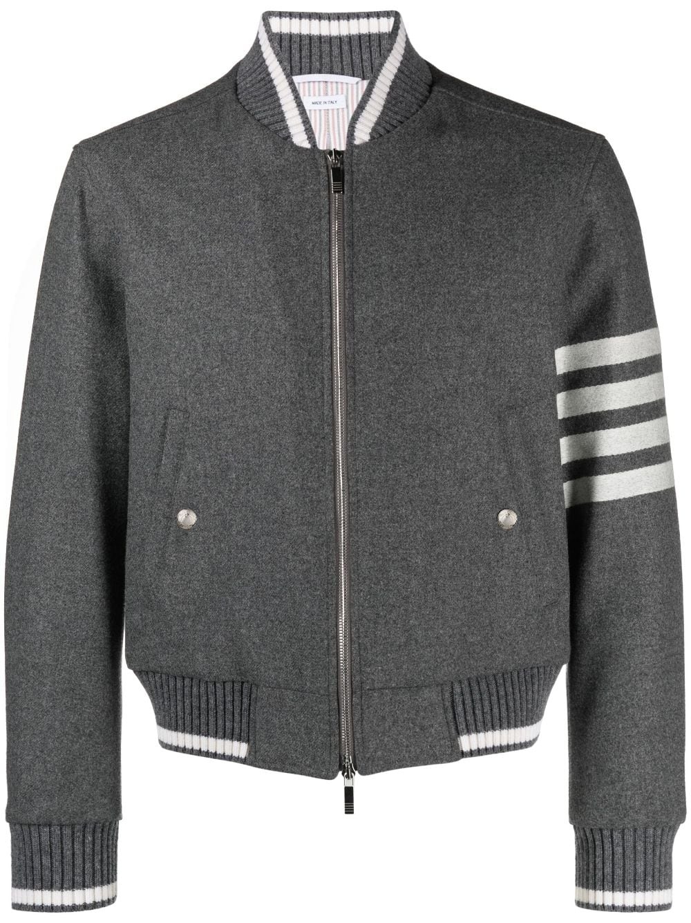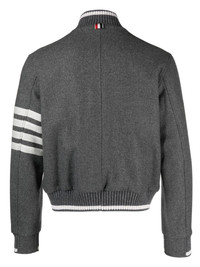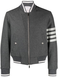 4-Bar stripe bomber jacket A classic, with a Thom Browne twist. In a medium grey shade, this bomber jacket is highlighted with a signature grosgrain loop tab at the rear and the usual 4-Bar stripe on the sleeve. Highlights - Medium grey - Cotton-wool blend - Stand-up collar - Two front welt pockets - Front zip fastening - Long sleeves - Signature 4-bar stripe Made in Italy Composition Outer: Wool 95%, Cashmere 5% Lining: Cotton 100%, Cupro 100% Virgin Wool 90%, Polyamide 9%, Elastane 1% SIZE & FIT Measurement CHEST 43.3 in(110 cm) SLEEVE LENGTH 24.4 in(62 cm) LENGTH 23.22 in(59 cm) WAIST 42.51 in(108 cm)