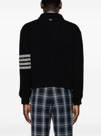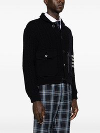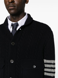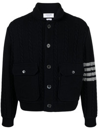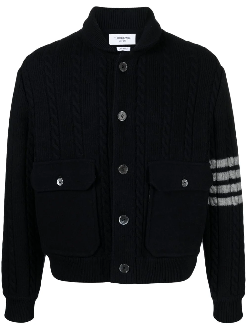 4-Bar stripe cable-knit jacket Highlights - Navy blue - Virgin wool blend - Cable knit - Signature 4-bar stripe - Rwb stripe - Shawl lapels - Front button fastening - Drop shoulder - Long sleeves - Ribbed cuffs and hem - Two front button-fastening flap pockets - Straight hem Made in Italy Composition Virgin Wool 76%, Cotton 23%, Polyamide 1% SIZE & FIT Model measurements Height 6 ft 2 in(1.87 m) Bust/Chest 36.41 in(92.5 cm) Hips 37 in(94 cm) Waist 29.52 in(75 cm) FittingInformation Designed for a boxy fit, intended for a loose fit throughout Made from a midweight non-stretch fabric, this piece offers minimal elasticity when worn This piece fits true to size – take your usual size