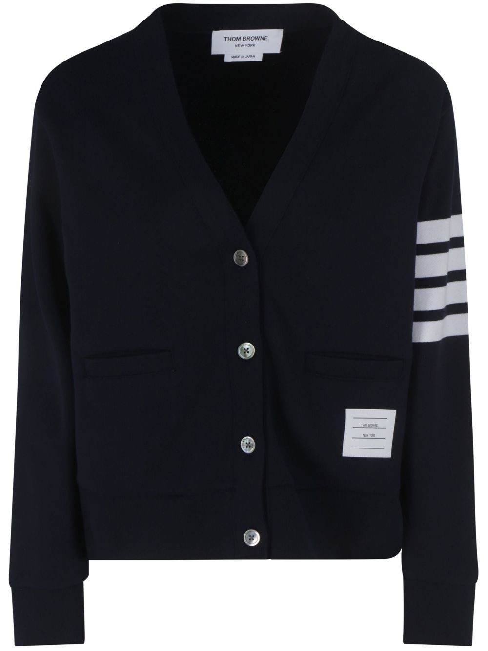 4-Bar stripe cardigan Is preppy style right up your street? Then you'll want to make this Thom Browne piece your new uniform. Go for an iconic touch with the 4-Bar stripe. Highlights - Navy/white - Cotton - V-neck - Signature grosgrain loop tab - Front button fastening - Long sleeves - Logo patch to the front - Two front welt pockets Imported Composition Cotton 100% SIZE & FIT Measurement SLEEVE LENGTH 18.89 in(48 cm) Shoulder Width 16.14 in(41 cm) LENGTH 22.04 in(56 cm) WAIST 38.18 in(97 cm) BUST 38.18 in(97 cm) Washing instructions Dry Clean Only