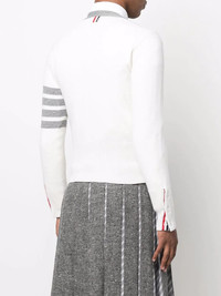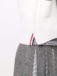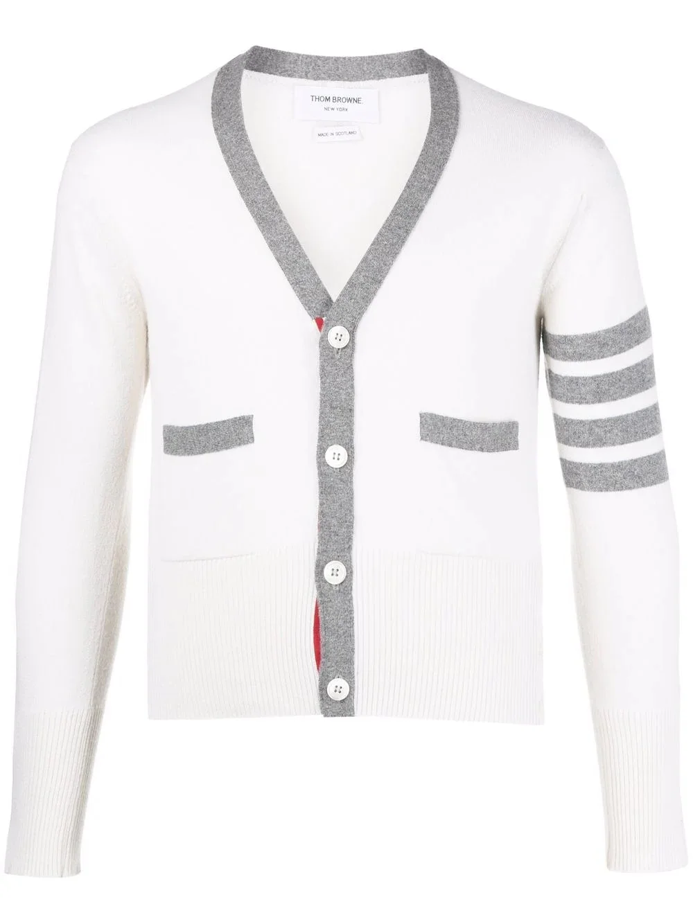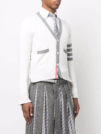 4-Bar stripe cashmere cardigan Thom Browne flaunts their aptitude for tailored knitwear in this two-tone cashmere cardigan. Presented in a streamlined silhouette, the brand's signature 4-Bar stripe detail appears at the sleeve for an elegantly branded finish. Made in Italy Composition Cashmere 100% SIZE & FIT Model measurements Height 6 ft 1 in(1.85 m) Bust/Chest 38.58 in(98 cm) Hips 37 in(94 cm) Waist 30.31 in(77 cm) FittingInformation This piece fits true to size. We recommend you get your regular size Cut for a slim fit Made with a mid-weight fabric