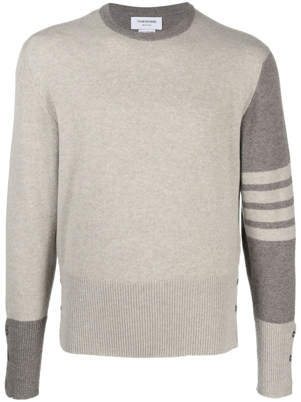 4-Bar Stripe cashmere jumper Crafted from sumptuous cashmere, this Thom Browne jumper offers a timeless crew-neck silhouette and is minimally detailed with the brand's signature 4-Bar Stripes enveloping the left sleeve. Highlights - Beige/light grey - Cashmere - Crew neck - Signature 4-bar stripe - Side button fastening - Long sleeves - Buttoned cuffs - Signature grosgrain loop tab - Ribbed cuffs and hem Made in United Kingdom Composition Cashmere 100% SIZE & FIT Model measurements Height 6 ft 2 in(1.87 m) Bust/Chest 35.82 in(91 cm) Hips 35.43 in(90 cm) Waist 27.95 in(71 cm)