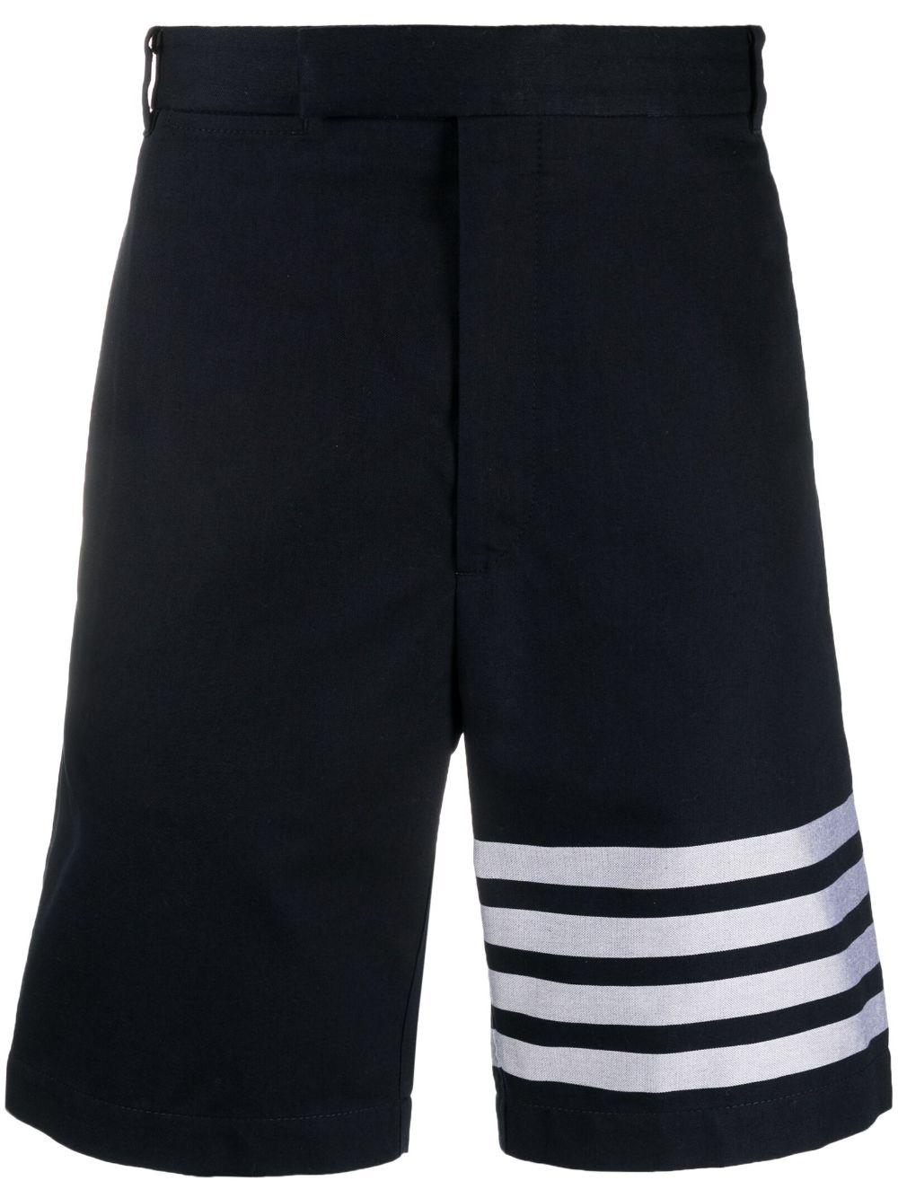 4 Bar-stripe cotton shorts Thom Browne brings its tailoring eye to its casual pieces with designs such as these shorts. The pair is cut from cotton for a straight leg, and boasts the iconic 4-Bar stripe in contrasting white at the leg. Highlights - Navy blue - Cotton - Signature 4-bar stripe - Belt loops - Concealed front fastening - Straight leg - Two rear button-fastening jetted pockets Made in Italy Composition Outer: Cotton 100%