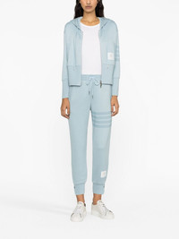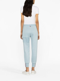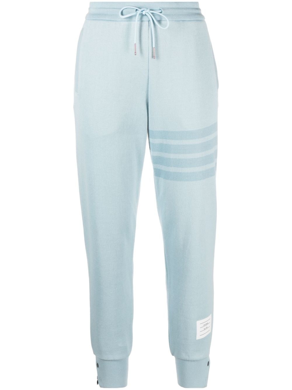 4-Bar-stripe cotton track pants Thom Browne decorates the casual, comfortable silhouette of these light blue track pants with a signature 4-Bar stripe in a tonal hue, wrapping around the left thigh. Highlights - Light blue - Cotton - Signature 4-bar stripe - Signature grosgrain loop tab - Elasticated drawstring waistband - Two side slit pockets - Ribbed ankles Imported Composition Outer: Cotton 100% SIZE & FIT Model measurements Height 5 ft 10 in(1.78 m) Bust/Chest 31.49 in(80 cm) Hips 35.03 in(89 cm) Waist 23.62 in(60 cm)