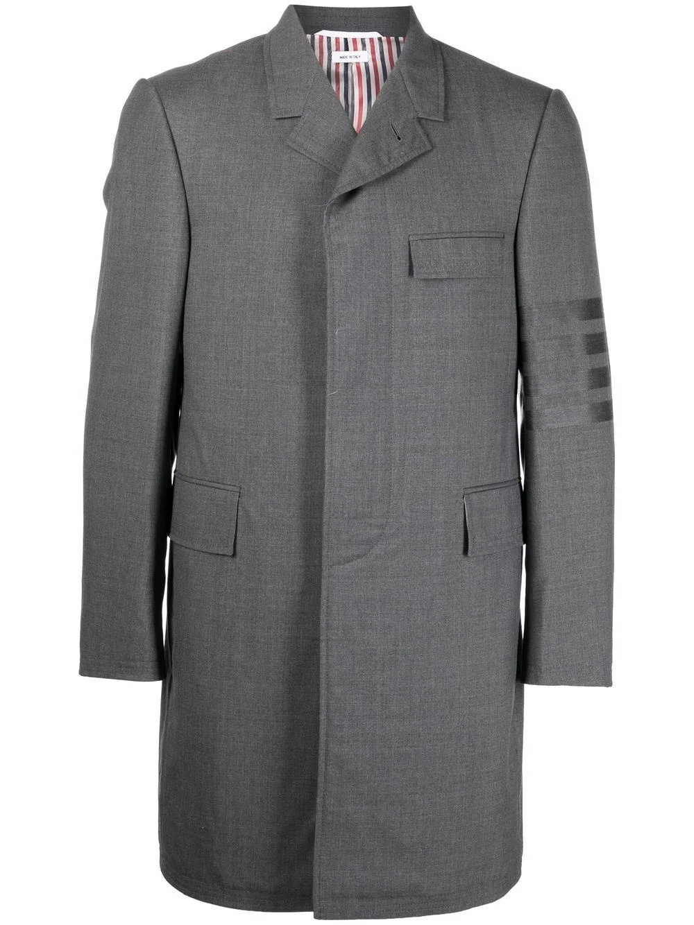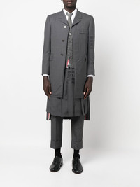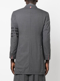 4-Bar Stripe elongated blazer Showcasing Thom Browne's signature 4-Bar Stripe motif at the arm, this mid-length blazer is a prime example of their impeccable tailoring skills. Spun from pure wool, it's completed with a concealed front fastening that's exaggerated by narrow notched lapels. Made in Italy Composition Lining: Cupro 100% Outer: Wool 100% SIZE & FIT Model measurements Height 6 ft 2 in(1.87 m) Bust/Chest 36.41 in(92.5 cm) Hips 37 in(94 cm) Waist 29.52 in(75 cm) FittingInformation This piece fits true to size. We recommend you get your regular size Cut for a slim fit Made with a mid-weight non-stretch fabric