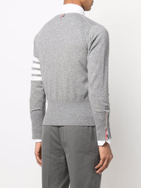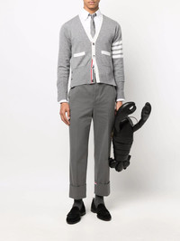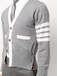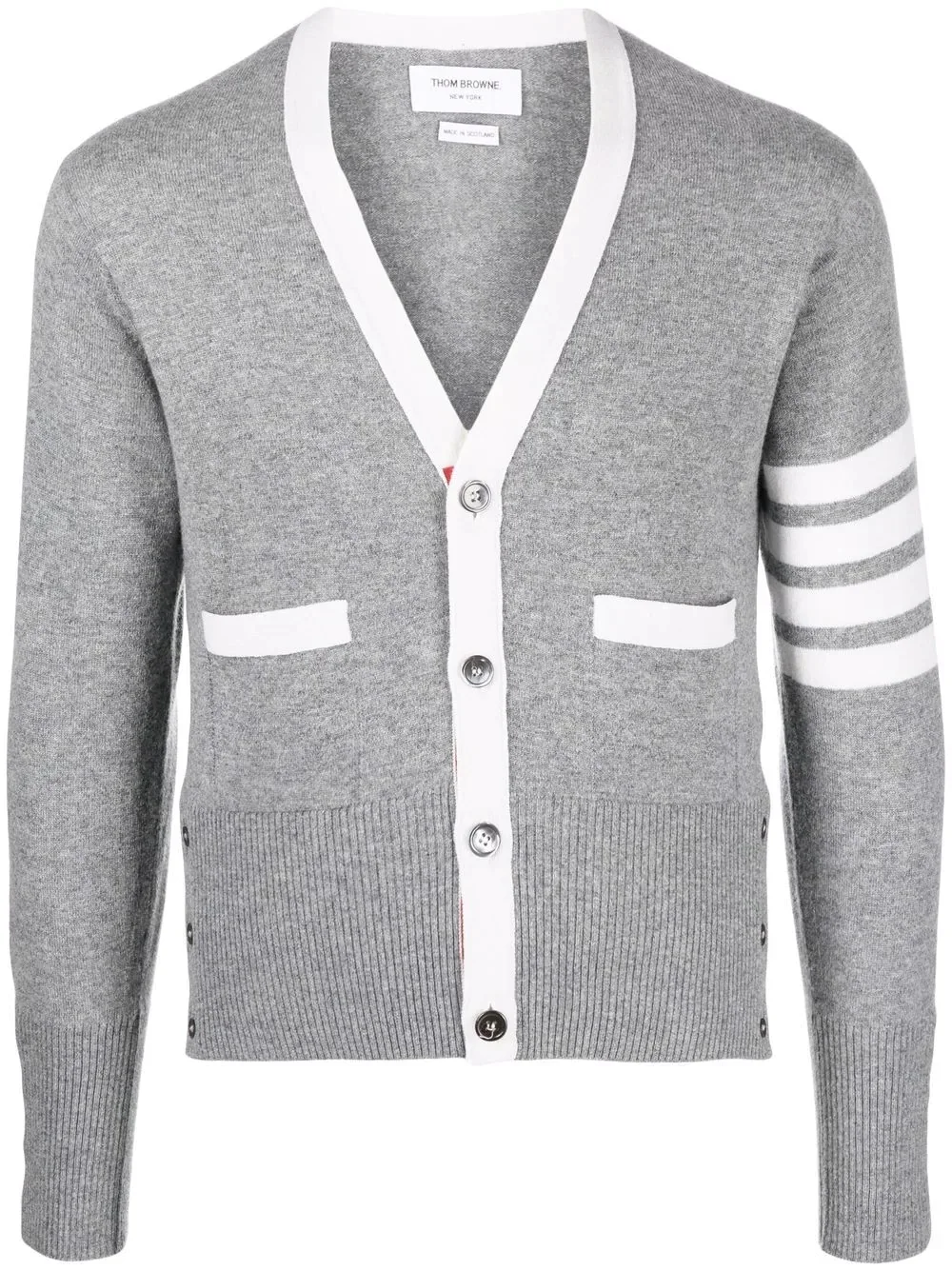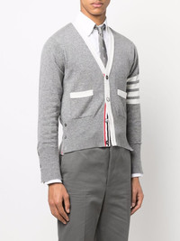 4-Bar stripe knit cardigan Thom Browne flaunts their aptitude for tailored knitwear in this two-tone cashmere cardigan. Presented in a streamlined silhouette, the brand's signature 4-Bar stripe detail appears at the sleeve for an elegantly branded finish. Made in Italy Composition Cashmere 100% SIZE & FIT Model measurements Height 6 ft 2 in(1.87 m) Bust/Chest 38.18 in(97 cm) Hips 36.61 in(93 cm) Waist 29.13 in(74 cm) FittingInformation This piece fits true to size. We recommend you get your regular size Cut for a slim fit Made with a mid-weight fabric