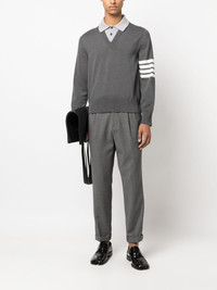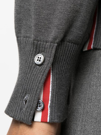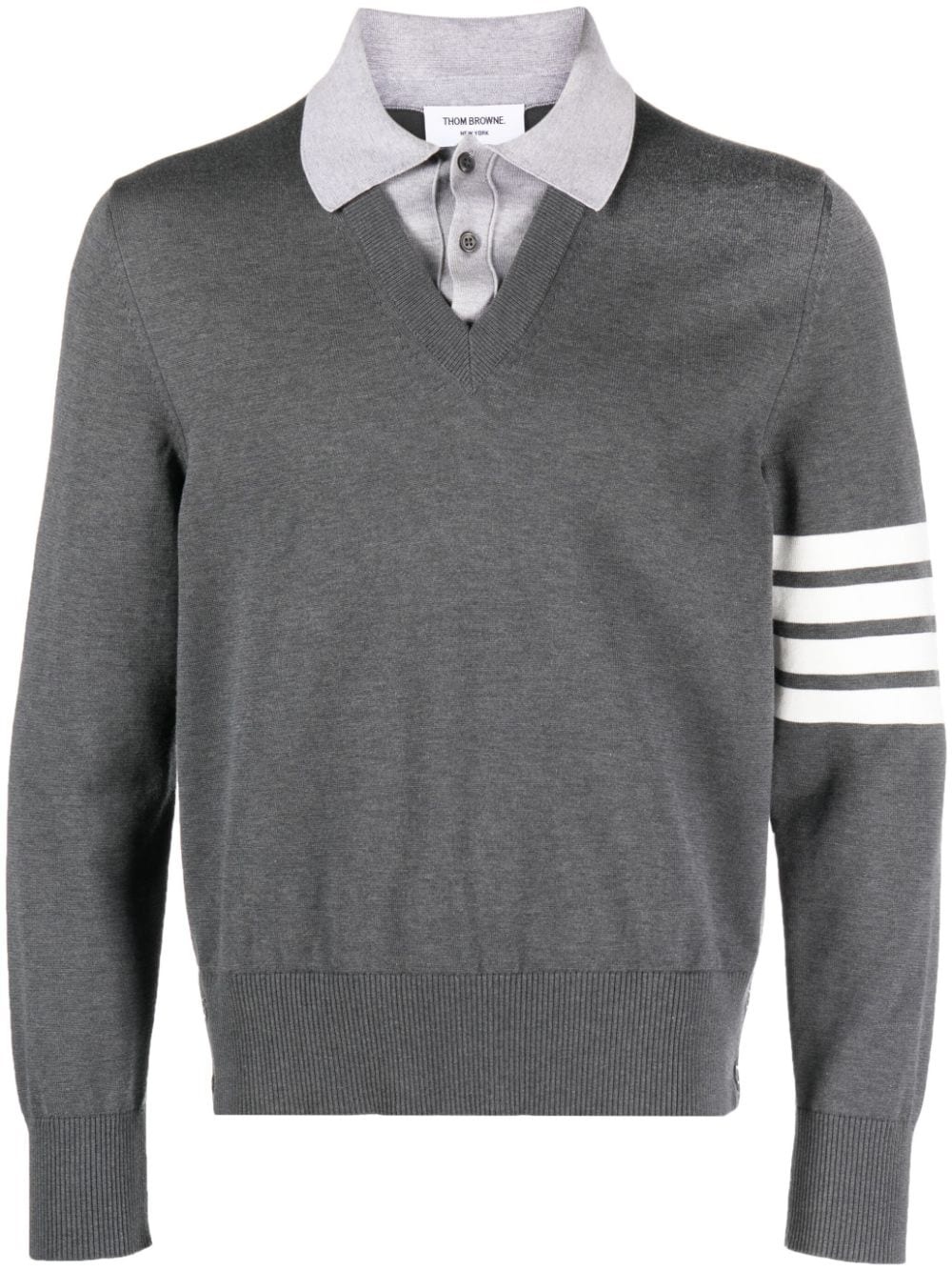 4-Bar stripe layered jumper Part of the SS24 collection, this piece by Thom Browne arrives in a layered design that juxtaposes a shirt collar with a V-neck jumper. It is crafted from cotton and cut to a silhouette accented with the label's signature 4-Bar stripes on the left sleeve. Highlights - Medium grey/light grey - Cotton - Layered design - Knitted construction - Fine knit - Signature 4-bar stripe - Signature grosgrain loop tab - Rwb stripe - Signature grosgrain side tabs - Long sleeves - Classic collar - Ribbed cuffs and hem - Straight hem Made in Italy Composition Cotton 100% SIZE & FIT Model measurements Height 6 ft 2 in(1.87 m) Bust/Chest 38.18 in(97 cm) Hips 36.61 in(93 cm) Waist 29.13 in(74 cm) FittingInformation Designed for a regular fit, this polo shirt offers a comfortable loose fit throughout the body Constructed with narrow shoulders Made with a midweight knit, this piece offers some stretch This piece fits true to size – take your usual size Washing instructions Dry Clean Only
