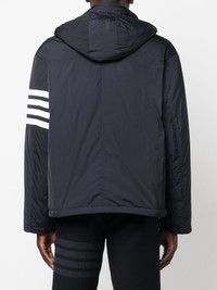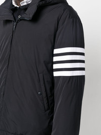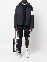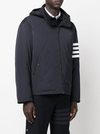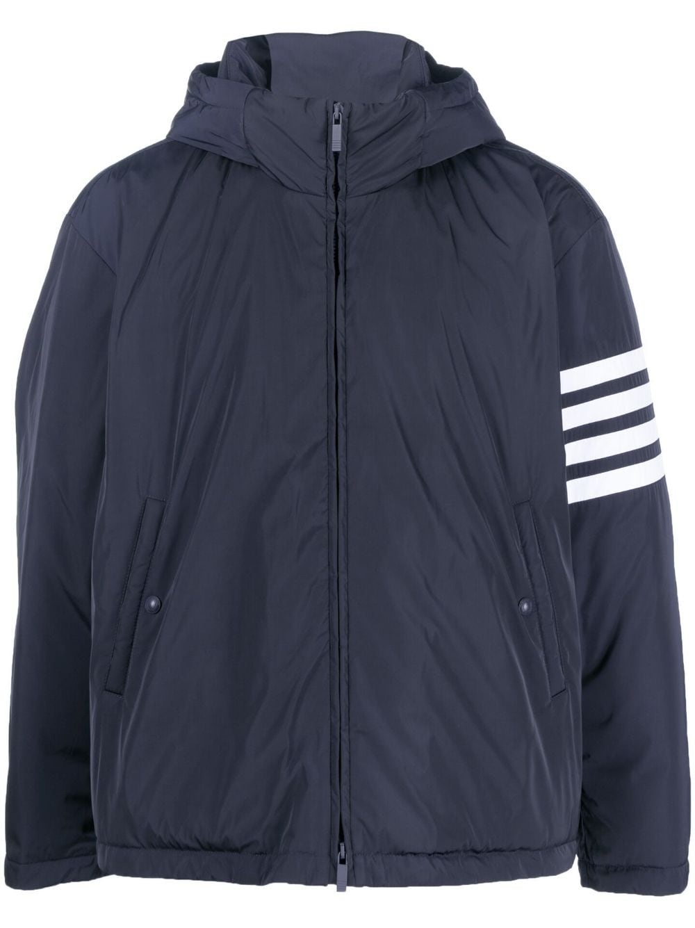 4-Bar stripe padded jacket Practicality merges with Thom Browne's sophisticated image in this navy and white padded jacket design. Presented in a subtle two-tone colour palette featuring the brand's signature 4-Bar stripe at the sleeve, the internal shoulder straps resemble tailored braces and allow for the style to hang off the back for added versatility. Made in Italy Composition Lining: Feather Down 100%, Polyester 100% Outer: Polyester 100% SIZE & FIT Model measurements Height 6 ft 2 in(1.87 m) Bust/Chest 36.41 in(92.5 cm) Hips 37 in(94 cm) Waist 29.52 in(75 cm) Measurement CHEST 41.73 in(106 cm) SLEEVE LENGTH 25.59 in(65 cm) LENGTH 26.37 in(67 cm) WAIST 42.51 in(108 cm) FittingInformation Designed for a slim fit, offering a comfortable fit that sits just away from the body Made from a padded non-stretch fabric, giving it no natural elasticity This piece fits true to size – take your usual size Washing instructions Dry Clean Only