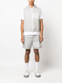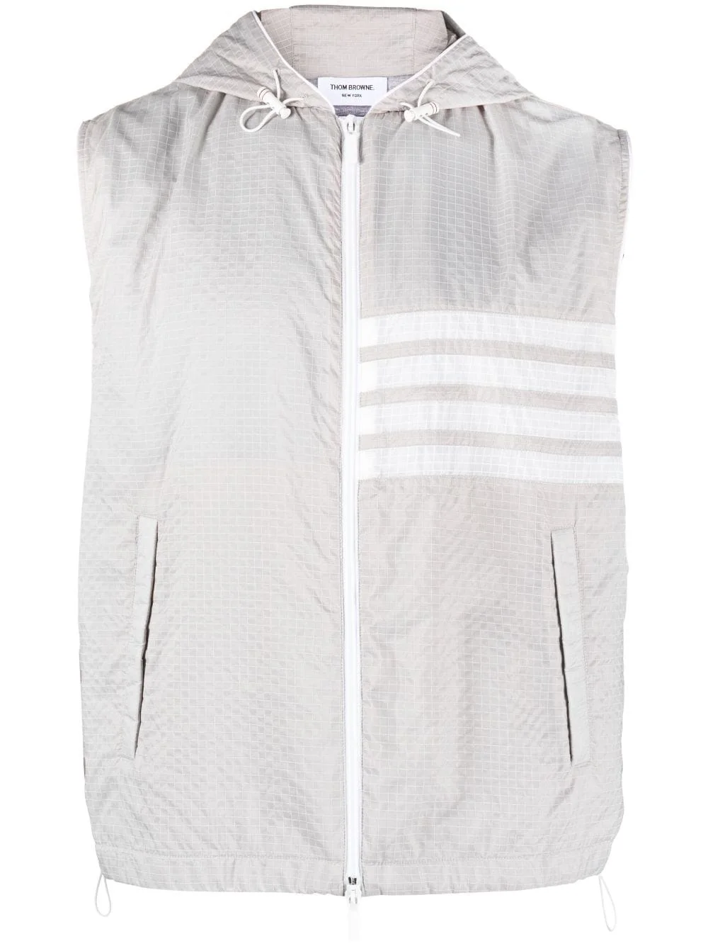 4-Bar stripe ripstop hooded gilet Crafted in Italy from ripstop nylon that lends its sleeveless body an ultra-light construction, this light grey hooded gilet from Thom Browne is infused with one of the house's most celebrated motifs: a 4-Bar stripe at the front. Highlights - Light grey/white - Ripstop texture - Lightweight construction - Drawstring hood - Front zip fastening - Signature 4-bar stripe - Two side slit pockets - Drawstring hem Made in Italy Composition Nylon 100% SIZE & FIT Model measurements Height 6 ft 2 in(1.87 m) Bust/Chest 38.18 in(97 cm) Hips 36.61 in(93 cm) Waist 29.13 in(74 cm) FittingInformation Designed for a regular fit, allowing for a comfortably loose fit throughout the body The internal drawstring at the hem allows for fitted preferences Made from a midweight non-stretch fabric This piece fits true to size – take your usual size Washing instructions Dry Clean Only