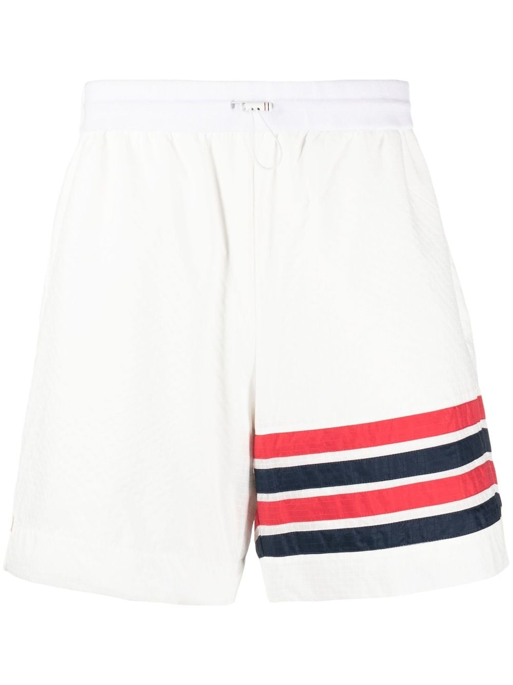 4-Bar stripe ripstop shorts Thom Browne's iconic 4-Bar stripes decorate these lightweight and durable ripstop shorts, combined with the RWB loop on the back, they add a signature touch to the sporty drawstring style. Highlights - White/red/navy blue - Ripstop texture - Signature 4-bar stripe - Signature grosgrain loop tab - Rwb stripe - Drawstring fastening waist - Thigh-length Made in Italy Composition Outer: Polyamide 100% Cotton 100% SIZE & FIT Model measurements Height 6 ft 2 in(1.87 m) Bust/Chest 38.18 in(97 cm) Hips 36.61 in(93 cm) Waist 29.13 in(74 cm) FittingInformation Designed for a regular fit, offering an even fit over the leg Adjust this piece’s waistband to your preference using the drawstring Made from a midweight fabric This piece fits true to size – take your usual size Measurement FRONT RISE 14.01 in(35.6 cm) WAIST 32 in(81.3 cm) BACK RISE 15 in(38.1 cm) HIPS 45.98 in(116.8 cm) Washing instructions Dry Clean Only
