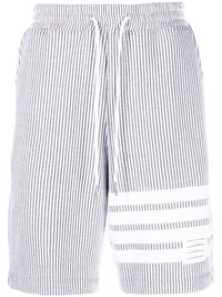 4-Bar stripe seersucker shorts Stripes are a Thom Browne signature, appearing throughout the label's collections. Here, they are seen adorning these seersucker shorts, finished with the house's iconic 4-Bar stripe motif. Made in Italy Composition Outer: Cotton 100% Lining: Cotton 100% SIZE & FIT Model measurements Height 6 ft 2 in(1.88 m) Bust/Chest 36.61 in(93 cm) Hips 35.82 in(91 cm) Waist 27.95 in(71 cm) Measurement FRONT RISE 13.38 in(34 cm) HIPS 39.37 in(100 cm) FittingInformation Designed for a regular fit, offering an even fit over the leg Made from a midweight non-stretch fabric This piece fits true to size – take your usual size