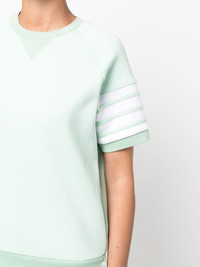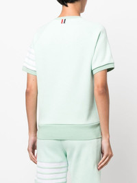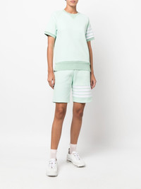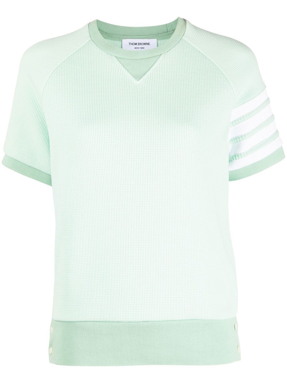 4-bar stripe T-shirt 4-bar stripe T-shirt from THOM BROWNE featuring light green, cotton, contrasting trim, logo patch to the side, round neck, short sleeves and straight hem. Made in Italy Composition Cotton 100% SIZE & FIT Model measurements Height 5 ft 10 in(1.78 m) Bust/Chest 33.07 in(84 cm) Hips 35.82 in(91 cm) Waist 25.98 in(66 cm) FittingInformation This piece fits true to size. We recommend you get your regular size Cut for a relaxed fit Made with a mid-weight fabric Washing instructions Dry Clean Only