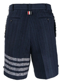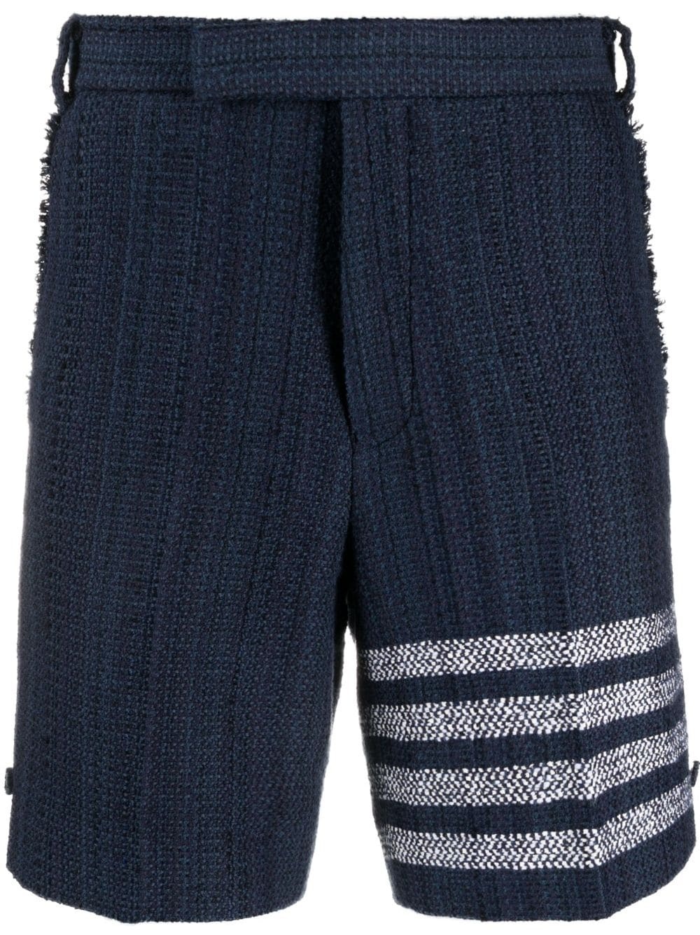 4 Bar-stripe tweed shorts Thom Browne subverts expectations by choosing tweed as the fabric for these shorts. It lends the pair a refined feel, accented by its tailored silhouette. Highlights - Navy blue - Cotton - Tweed - Signature 4-bar stripe - Belt loops - Concealed front fastening - Pressed crease - Two rear button-fastening jetted pockets Imported Composition Fabric 100%