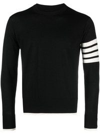 4-Bar stripe virgin wool jumper Stripes are a Thom Browne hallmark, as shown with this black jumper. Knitted from virgin wool, it boasts a minimalist crew-neck silhouette adorned with the brand's signature 4-Bar stripe at the sleeve and RWB stripe at the cuffs and sides. Highlights - Black/white - Virgin wool - Fine knit - Signature 4-bar stripe - Rwb stripe - Crew neck - Drop shoulder - Long sleeves - Ribbed cuffs and hem - Signature grosgrain side tabs - Straight hem Made in Italy Composition Virgin Wool 100% SIZE & FIT Model measurements Height 6 ft 2 in(1.88 m) Bust/Chest 36.61 in(93 cm) Hips 35.82 in(91 cm) Waist 27.95 in(71 cm) FittingInformation Designed for a slim fit, offering a comfortable fit that sits just away from the body Made with a midweight knit, this piece offers some stretch This piece fits true to size – take your usual size Measurement CHEST 37 in(94 cm) SLEEVE LENGTH 31.1 in(79 cm) LENGTH 23.62 in(60 cm)