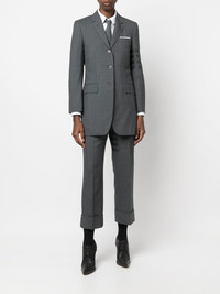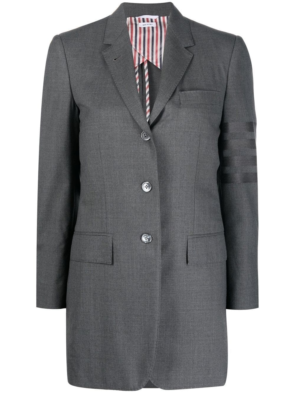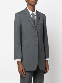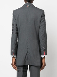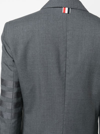 4-Bar stripe wool blazer 4-Bar stripe wool blazer from THOM BROWNE featuring dark grey, wool, signature 4-Bar stripe, signature grosgrain loop tab, notched lapels, front button fastening, chest welt pocket, front flap pockets, long sleeves and buttoned cuffs. Made in Italy Composition Lining: Cupro 100% Outer: Wool 100% SIZE & FIT Model measurements Height 5 ft 10 in(1.78 m) Bust/Chest 31.49 in(80 cm) Hips 37 in(94 cm) Waist 23.62 in(60 cm) FittingInformation This piece fits true to size. We recommend you get your regular size Cut for a slim fit Made with a mid-weight non-stretch fabric Washing instructions Dry Clean Only