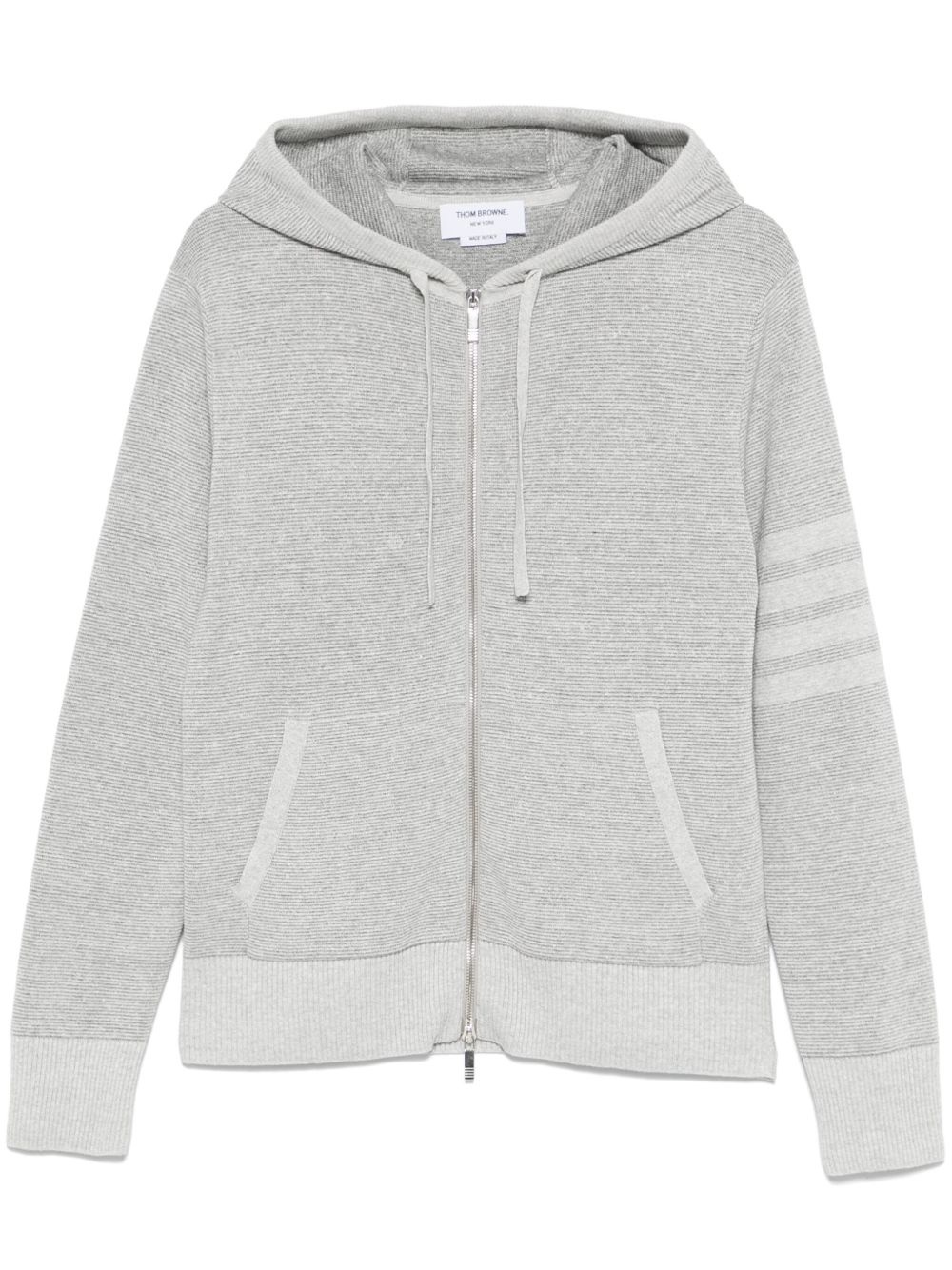 4-Bar stripe zip-up hoodie Highlights - Zen grey - Front two-way zip fastening - Two front pouch pockets - Ribbed cuffs and hem Made in Italy Composition Linen/Flax 68%, Cotton 32% SIZE & FIT Model measurements Height 6 ft 2 in(1.87 m) Bust/Chest 37.79 in(96 cm) Hips 37.79 in(96 cm) Waist 30.31 in(77 cm) FittingInformation Designed for a relaxed fit, this piece allows for comfort and movement when worn Made from a midweight non-stretch fabric, this piece offers minimal elasticity when worn
