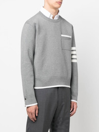 4-Bar striped jumper Since 2001, New York-based designer Thom Browne has radically changed the world of tailoring. Looking at each design with a contemporary edge, this knitted jumper from the SS23 collection is finished with the label's signature 4-Bar logo along the sleeve for added charm. Made in Italy Composition Cotton 100% SIZE & FIT Model measurements Height 6 ft 1 in(1.86 m) Bust/Chest 36.61 in(93 cm) Hips 37 in(94 cm) Waist 28.74 in(73 cm) FittingInformation This piece fits true to size. We recommend you get your regular size Cut for a relaxed fit Made with a mid-weight fabric