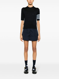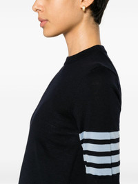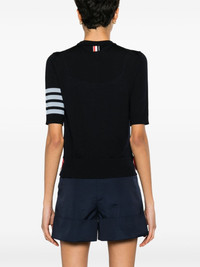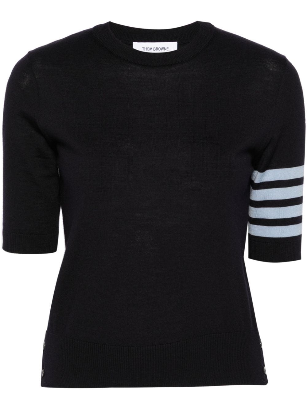 4-Bar Stripes intarsia-knit T-shirt Highlights - Navy blue/light blue - Virgin wool blend - Fine knit - Intarsia knit - Signature 4-bar stripe at the sleeves - Crew neck - Short sleeves - Logo pull-tab - Signature grosgrain side tabs - Straight hem Made in Italy Composition Virgin Wool 99%, Polyamide 1% SIZE & FIT Model measurements Height 5 ft 9 in(1.76 m) Bust/Chest 31.88 in(81 cm) Hips 35.43 in(90 cm) Waist 24.8 in(63 cm) FittingInformation Designed for a slim fit that sits just away from the body offering a close yet comfortable fit Made with a midweight knit, this piece offers some stretch This piece fits true to size – take your usual size