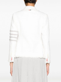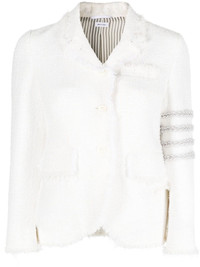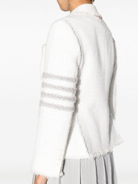 4-Bar tweed jacket Without an official logo, Thom Browne's garments are identified by their signature silhouettes and iconic 4-Bar stripes. Seen here in a braided design, they adorn the left sleeve of this tweed jacket. Highlights - Off-white - Silk - Tweed - Signature 4-bar stripe - Signature grosgrain loop tab - Notched lapels - Front button fastening - Long sleeves - Buttoned cuffs - Slit pocket at the chest - Two front flap pockets - English rear vents Made in Italy Composition Lining: Silk 100% Outer: Silk 100% Polyester 100% SIZE & FIT Model measurements Height 5 ft 11 in(1.8 m) Bust/Chest 33.07 in(84 cm) Hips 37 in(94 cm) Waist 25.59 in(65 cm) Measurement BUST 32.28 in(82 cm) LENGTH 23.22 in(59 cm) Shoulder Width 14.96 in(38 cm) SLEEVE LENGTH 20.86 in(53 cm) WAIST 32.28 in(82 cm) FittingInformation Designed for a slim fit that sits just away from the body offering a close yet comfortable fit The vented hem offers movement at the rear Made from a midweight non-stretch fabric This piece fits true to size – take your usual size Washing instructions Dry Clean Only