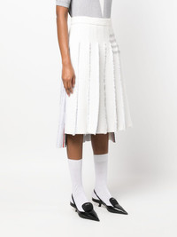 4-Bar tweed pleated skirt Thom Browne takes a new approach to its signature 4-Bar stripe. Presented with a bead embellishment, the motif decorates the left side of this pleated skirt. Highlights - Off-white/light grey - Cotton/silk - Tweed - Fully pleated - Vertical stripe print - Signature 4-bar stripe - Signature grosgrain loop tab - High waist - Concealed side zip fastening - Mid-length Made in Italy Composition Outer: Cotton 100%, Silk 100%, Polyester 100% Lining: Silk 100% SIZE & FIT Model measurements Height 5 ft 11 in(1.8 m) Bust/Chest 31.88 in(81 cm) Hips 35.03 in(89 cm) Waist 24.01 in(61 cm) FittingInformation This midi-length skirt is intended to be worn high on the waist Made from a midweight non-stretch fabric This piece fits true to size – take your usual size Washing instructions Dry Clean Only
