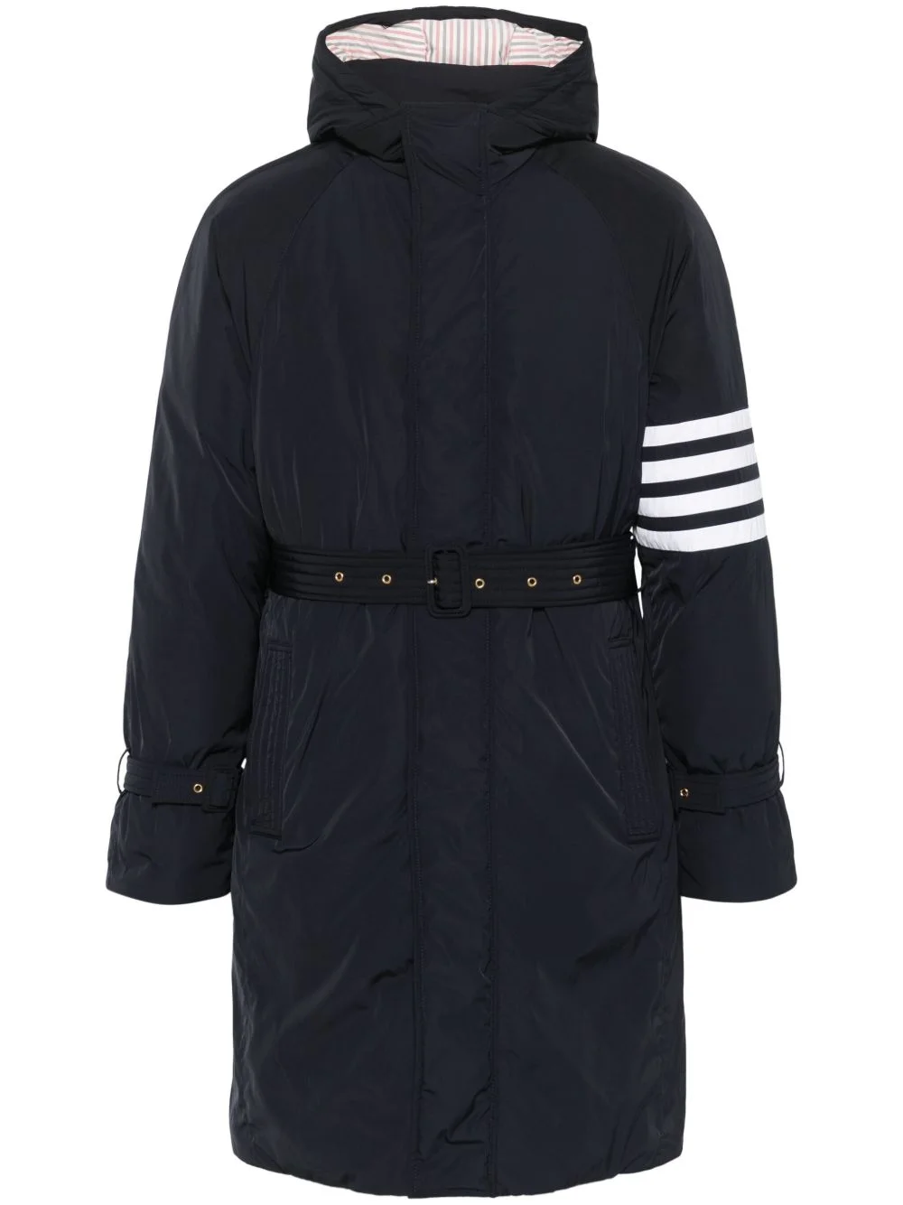 4-Bar twill belted parka Highlights - Navy blue - Front press-stud and zip fastening - Two side slit pockets - Classic hood - Belted cuffs Made in Italy Composition Outer: Polyester 100% Lining: Polyester 100%, Real Down 100% Washing instructions Dry Clean Only