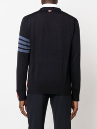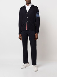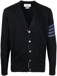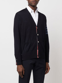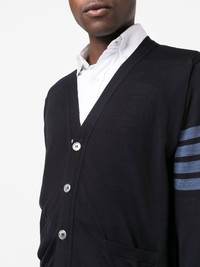 4-Bar V-neck cardigan Rendered in a deep navy colour, this V-neck cardigan from Thom Browne is decorated with the house's instantly recognisable 4-Bar motif at the sleeve and RWB grosgrain tab at the rear. Highlights - Navy blue - Merino wool - V-neck - Signature 4-bar stripe - Front button fastening - Two front patch pockets - Long sleeves - Ribbed cuffs and hem - Rwb stripe Imported Composition Merino 100% SIZE & FIT Measurement CHEST 37 in(94 cm) LENGTH 23.62 in(60 cm) SLEEVE LENGTH 22.83 in(58 cm) Shoulder Width 14.96 in(38 cm) Washing instructions Read Manufacturer Guidelines