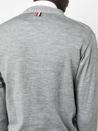 4-Bar V-neck cardigan Rendered in a light shade of grey, this V-neck cardigan from Thom Browne is decorated with the house's instantly recognisable 4-Bar motif at the sleeve and RWB grosgrain tab at the rear. Highlights - Light grey - Merino wool - V-neck - Signature 4-bar stripe - Front button fastening - Two front patch pockets - Long sleeves - Ribbed cuffs and hem - Rwb stripe Imported Composition Merino 100% SIZE & FIT Measurement CHEST 37 in(94 cm) SLEEVE LENGTH 22.83 in(58 cm) Shoulder Width 14.96 in(38 cm) LENGTH 23.62 in(60 cm)
