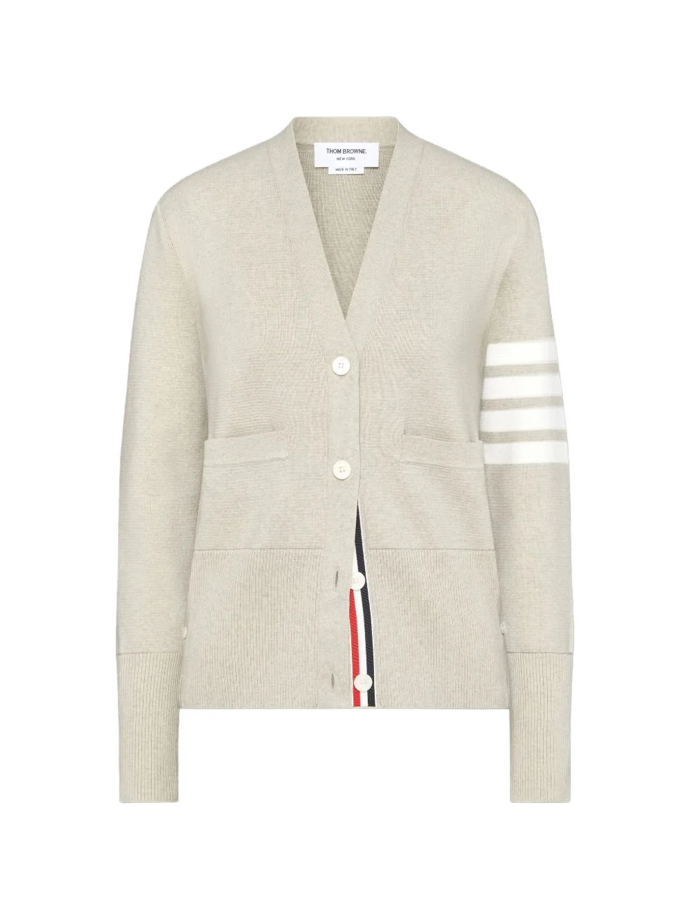 4-bar V-neck cardigan Highlights - Beige - Four-bar detailing on the arm - V-neck - Front button fastening - Front pockets - Ribbed hem and cuffs Made in Italy Composition Cotton 100% Washing instructions Read Manufacturer Guidelines