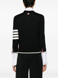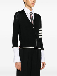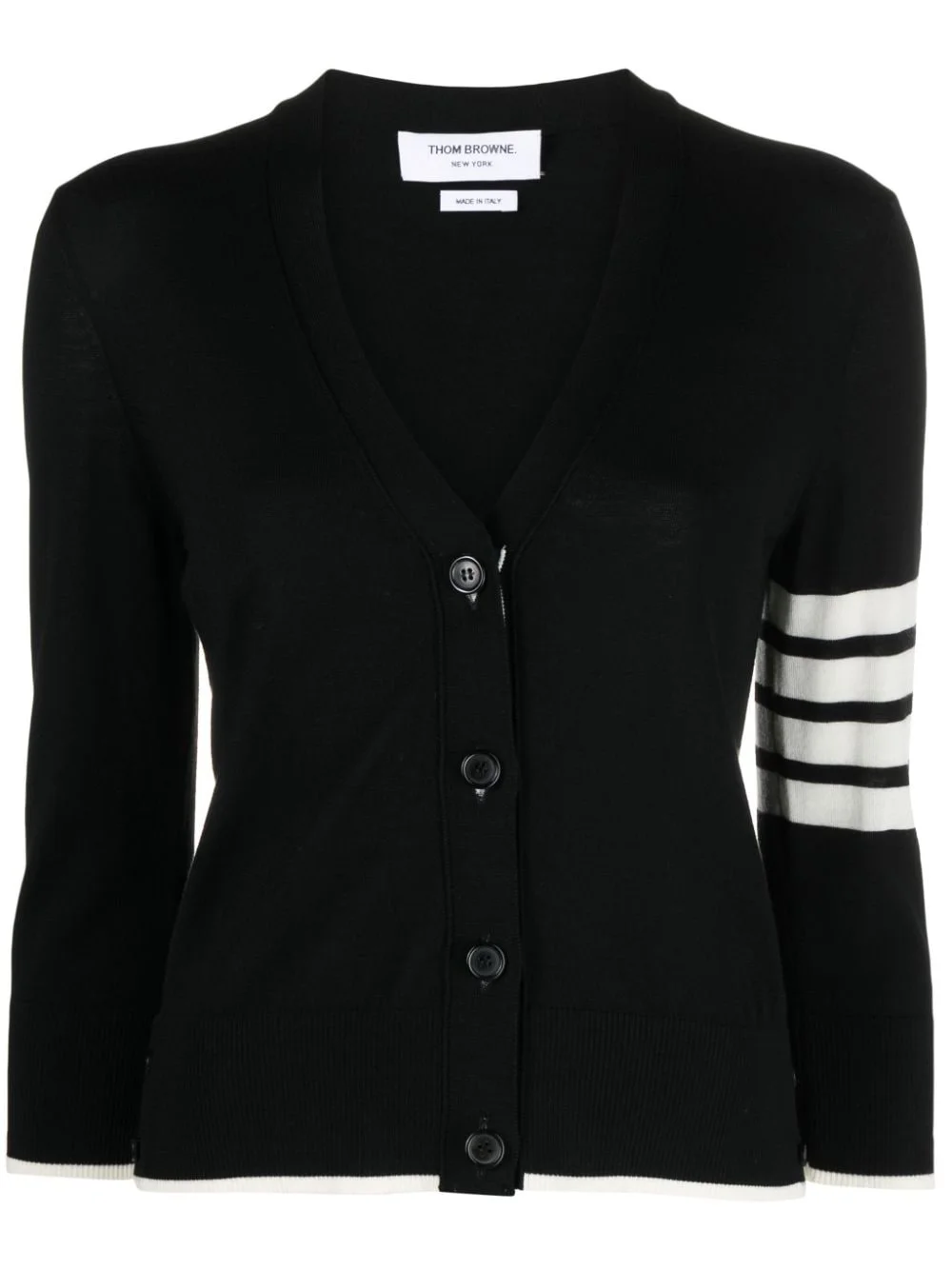4-Bar virgin wool cardigan Highlights - Black - Virgin wool blend - Knitted construction - Signature 4-bar stripe - V-neck - Front button fastening - Long sleeves - Buttoned cuffs - Ribbed cuffs and hem - Button fastening side slits - Straight hem Made in Italy Composition Virgin Wool 99%, Polyamide 1% SIZE & FIT Model measurements Height 5 ft 9 in(1.76 m) Bust/Chest 31.88 in(81 cm) Hips 35.43 in(90 cm) Waist 24.8 in(63 cm) FittingInformation Designed for a slim fit that sits just away from the body offering a close yet comfortable fit Made with a midweight knit, this piece offers some stretch This piece fits true to size – take your usual size
