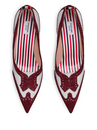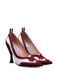105mm calf-suede low-throat wingtip pumps Highlights - Burgundy red - Suede panelling - Sculpted heel - Perforated detailing - Pointed toe Made in Italy Composition Sole: Calf Leather 100% Outer: Calf Suede 100% Lining: Calf Leather 100%
