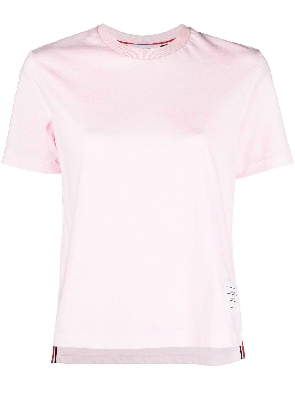 anchor-print T-shirt Thom Browne embraces a nautical theme with this T-shirt. In a tonal pink hue, an anchor print details the piece, adding a lively finish to the design. Made in Italy Composition Cotton 100% SIZE & FIT Model measurements Height 5 ft 10 in(1.78 m) Bust/Chest 33.07 in(84 cm) Hips 35.82 in(91 cm) Waist 25.98 in(66 cm) FittingInformation This piece fits true to size. We recommend you get your regular size Cut for a relaxed fit Made with a mid-weight fabric