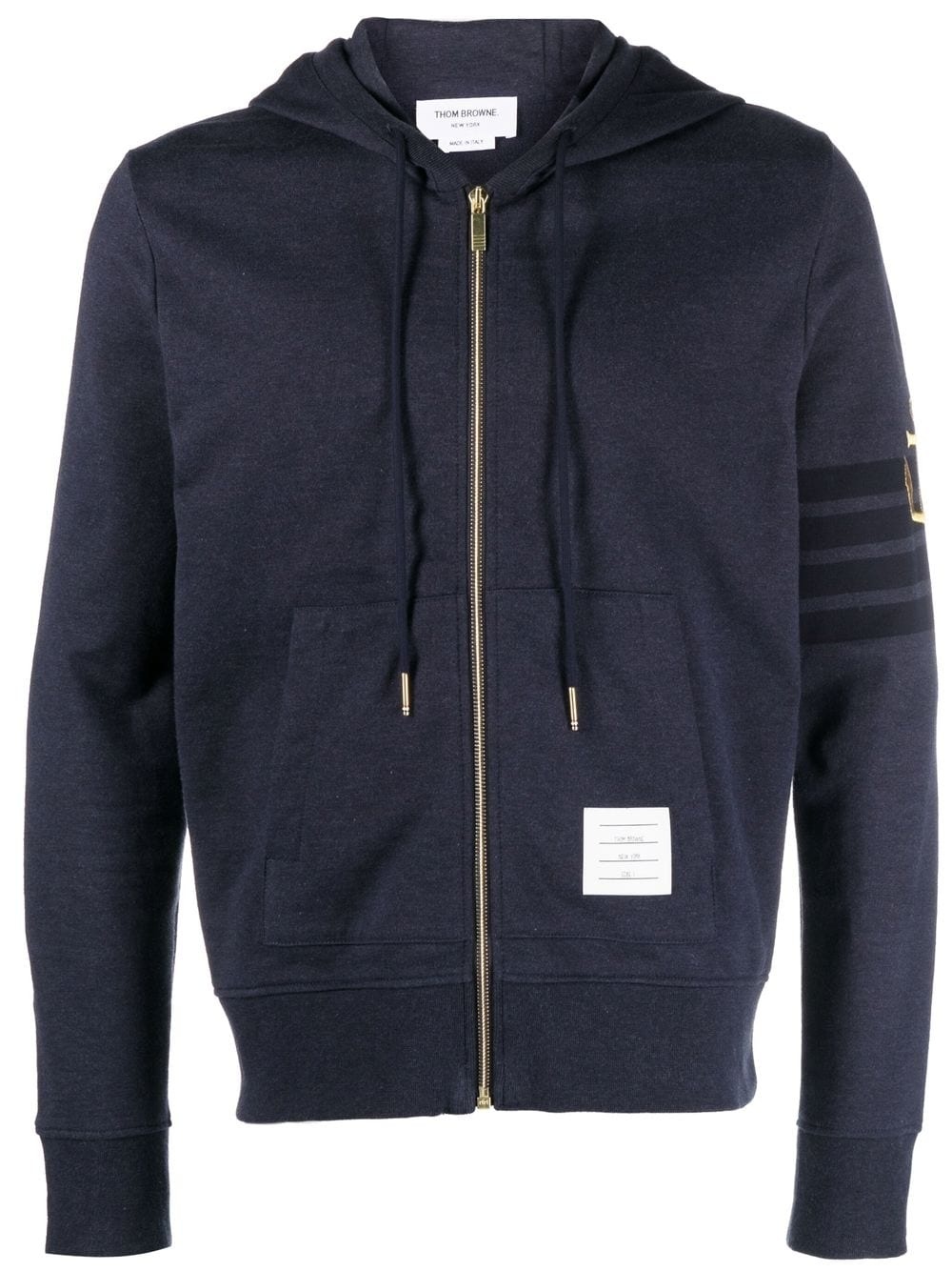 Anchor zip-up hoodie Spun in Italy from soft cotton, this zip-up hoodie is punctuated with an embroidered Anchor at the sleeve, one of the recurrent motifs found across Thom Browne's SS23 collection. A tonal 4-Bar stripe and signature logo tag lend an instantly recognisable appeal to the piece. Made in Italy Composition Cotton 100% SIZE & FIT Model measurements Height 6 ft 2 in(1.88 m) Bust/Chest 36.61 in(93 cm) Hips 35.82 in(91 cm) Waist 27.95 in(71 cm) FittingInformation This piece fits true to size. We recommend you get your regular size Cut for a relaxed fit Made with a mid-weight fabric