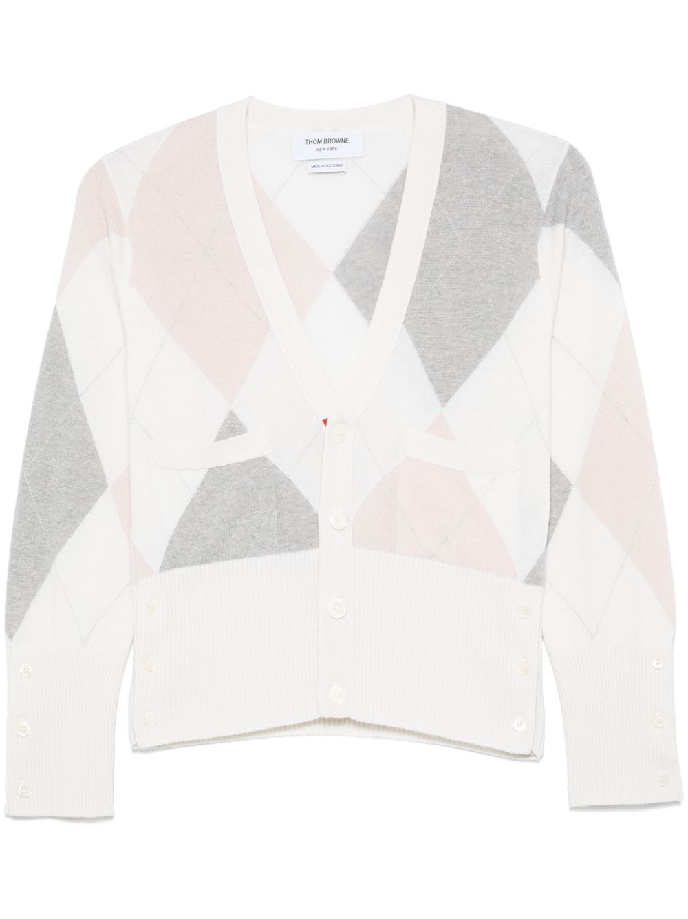 argyle-intarsia cashmere jumper Highlights - White - Front button fastening - V-neck - Long sleeves - Two front patch pockets Made in United Kingdom Composition Cashmere 100% SIZE & FIT Model measurements Height 5 ft 11 in(1.8 m) Bust/Chest 31.49 in(80 cm) Hips 35.82 in(91 cm) Waist 24.8 in(63 cm) FittingInformation Designed for a slim fit that sits just away from the body offering a close yet comfortable fit Made with a lightweight knit, this piece offers some stretch Washing instructions Dry Clean Only