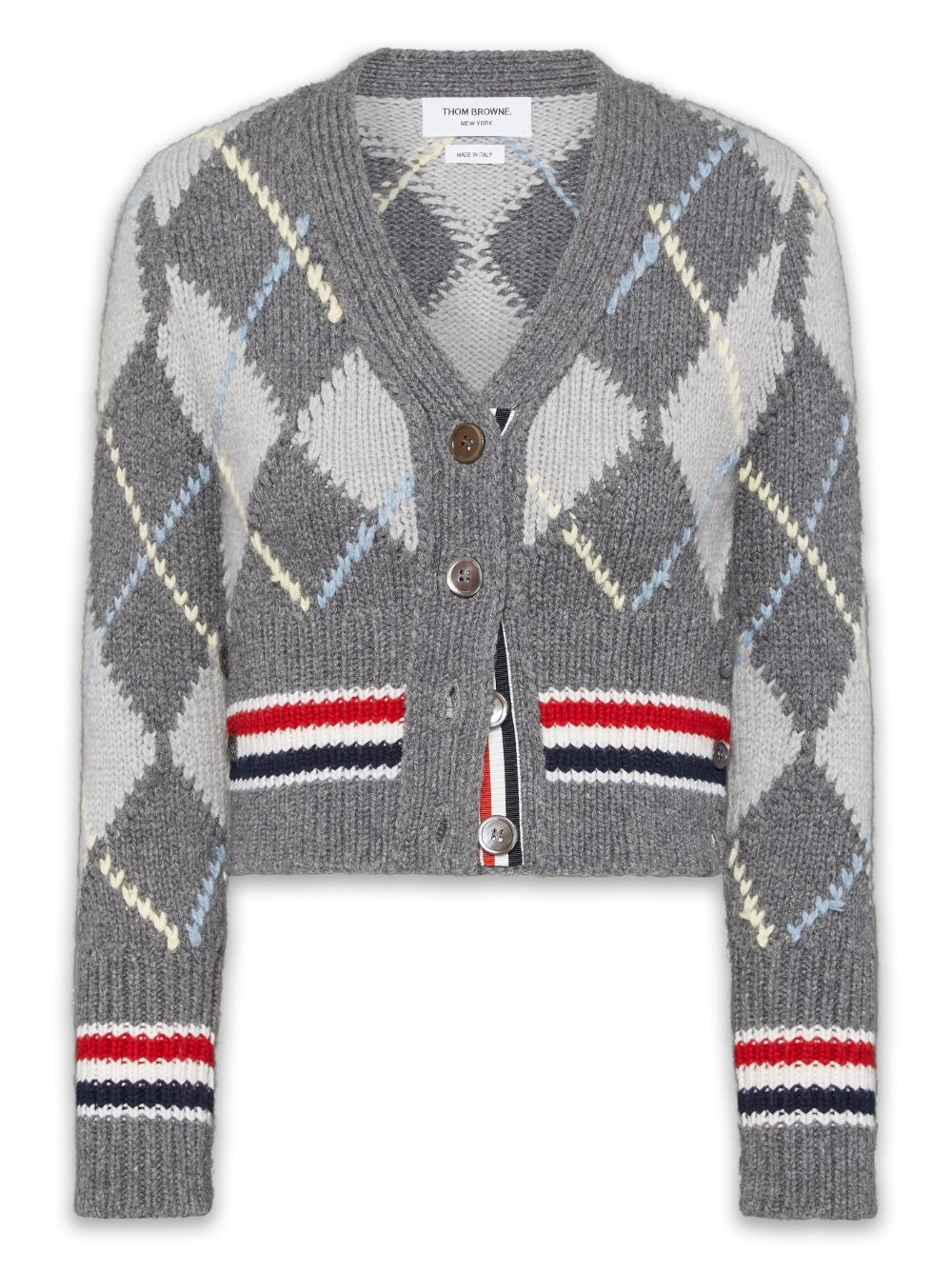argyle-intarsia merino-wool cardigan Highlights - Tonal grey - Argyle pattern - V-neck - Three-stripe detail - Wool - Button fastening Made in Italy Composition Wool 100%