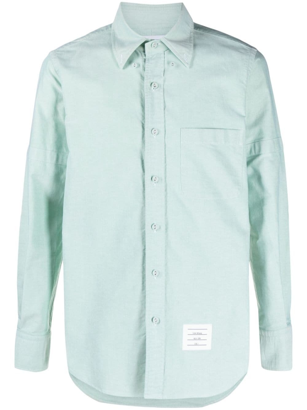 armband-embellished cotton shirt Thom Browne is known for enhancing classic tailoring with signature house hallmarks. A case in point, this green cotton-poplin shirt is adorned with a grosgrain armband and an RWB loop at the nape. Highlights - Light green - Cotton - Poplin texture - Logo patch to the front - Locker loop - Signature grosgrain loop tab - Pleat detailing - Button-down collar - Front button fastening - Long sleeves - Adjustable armband - Buttoned cuffs - Chest patch pocket - Curved hem Made in Italy Composition Cotton 100% SIZE & FIT Model measurements Height 6 ft 2 in(1.88 m) Bust/Chest 36.61 in(93 cm) Hips 35.82 in(91 cm) Waist 27.95 in(71 cm) FittingInformation Designed for a slim fit, offering a comfortable fit that sits just away from the body Made from a midweight non-stretch fabric This piece fits true to size – take your usual size