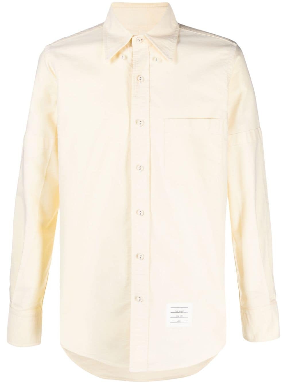 armband-embellished cotton shirt Thom Browne is known for enhancing classic tailoring with signature house hallmarks. A case in point, this yellow cotton-poplin shirt is adorned with a grosgrain armband and an RWB loop at the nape. Highlights - Light yellow - Cotton - Logo patch to the front - Signature grosgrain loop tab - Locker loop - Rwb stripe - Pleat detailing - Button-down collar - Front button fastening - Long sleeves - Adjustable armband - Buttoned cuffs - Chest patch pocket - Curved hem Made in Italy Composition Cotton 100% SIZE & FIT Model measurements Height 6 ft 2 in(1.88 m) Bust/Chest 36.61 in(93 cm) Hips 35.82 in(91 cm) Waist 27.95 in(71 cm) FittingInformation Designed for a slim fit, offering a comfortable fit that sits just away from the body Made from a midweight non-stretch fabric This piece fits true to size – take your usual size