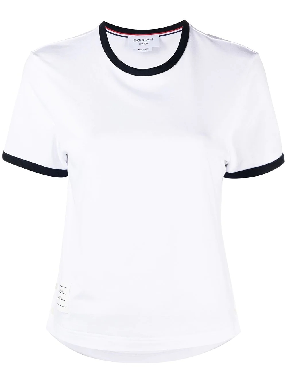 asymmetric hem short-sleeve T-shirt Known for its original take on classic silhouettes, Thom Browne uses high-quality materials to create perfectly crafted pieces with eye-catching details. Made from cotton, this T-shirt completes the brand's AW21 collection and is embellished with a 4-Bar patch and RWB stripes. An asymmetric hem and contrasting trims add a modern feel to this versatile piece. Highlights - White - Cotton - Short sleeves - Round neck - Contrasting trim - Signature 4-bar tab - Rwb stripe - Asymmetric hem Imported Composition Outer: Cotton 100%