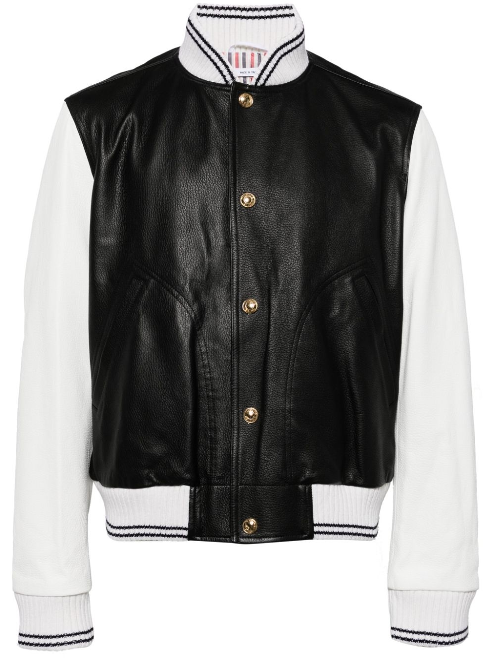 blouson leather jacket Highlights - Black/white - Lambskin - Colour-block panelled design - Stripe trim - Mock neck - Front press-stud fastening - Long sleeves - Two side slit pockets - Ribbed cuffs and hem Made in Italy Composition Outer: Lamb Skin 100% Lining: Cupro 100% SIZE & FIT Model measurements Height 6 ft 2 in(1.87 m) Bust/Chest 33.07 in(84 cm) Hips 35.43 in(90 cm) Waist 26.77 in(68 cm) FittingInformation Designed to be unstructured, offering a loose fit throughout The ribbed hem offers a close, comfortable fit Soft leather has a supple and smooth construction offering some flexibility This piece fits true to size – take your usual size
