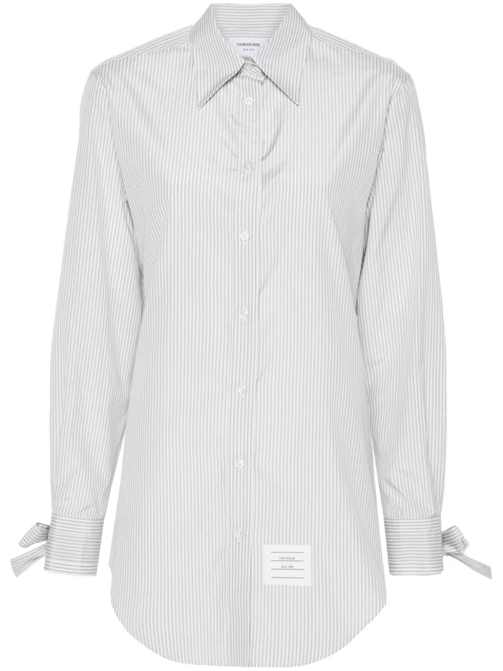 bow-cuff shirt dress Highlights - White/light grey - Silk-cotton blend - Poplin texture - Vertical stripe pattern - Pointed flat collar - Long sleeves - Buttoned tied cuffs - Logo patch to the front - Thigh-length - Signature grosgrain loop tab at the back - Curved hem - Front button fastening Made in Italy Composition Silk 66%, Cotton 34% SIZE & FIT Model measurements Height 5 ft 10 in(1.77 m) Bust/Chest 32.28 in(82 cm) Hips 35.03 in(89 cm) Waist 25.19 in(64 cm) FittingInformation Designed for a relaxed fit, this piece allows for comfort and movement when worn Made from a lightweight non-stretch fabric This piece fits true to size – take your usual size Washing instructions Dry Clean Only
